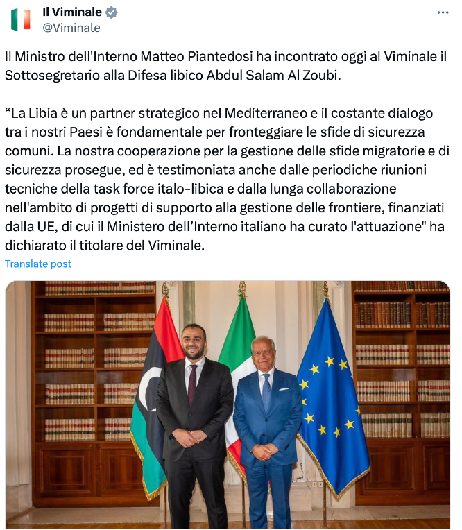 Ma c’è di più: Abdul Salam Al-Zoubi è uno degli interlocutori privilegiati del Governo italiano, uno di quelli con cui si vantano di una “proficua collaborazione” nella “gestione delle frontiere”. Il 4 settembre scorso – pochi giorni dopo il caso che ha visto i militari ai suoi ordini protagonisti delle minacce contro Mediterranea e del violento traffico di esseri umani - è stato ricevuto con tutti gli onori dal ministro dell’Interno Matteo Piantedosi. E, secondo autorevoli osservatori della situazione in Libia, è uno dei principali “cavalli” su cui l’Italia ha puntato per sostituire l’ormai compromesso Almasri e i suoi compari. Sembrerebbe anche e soprattutto nella “guerra sporca” contro le persone migranti e le navi del soccorso civile. Tutto a posto a Tripoli e a Roma?