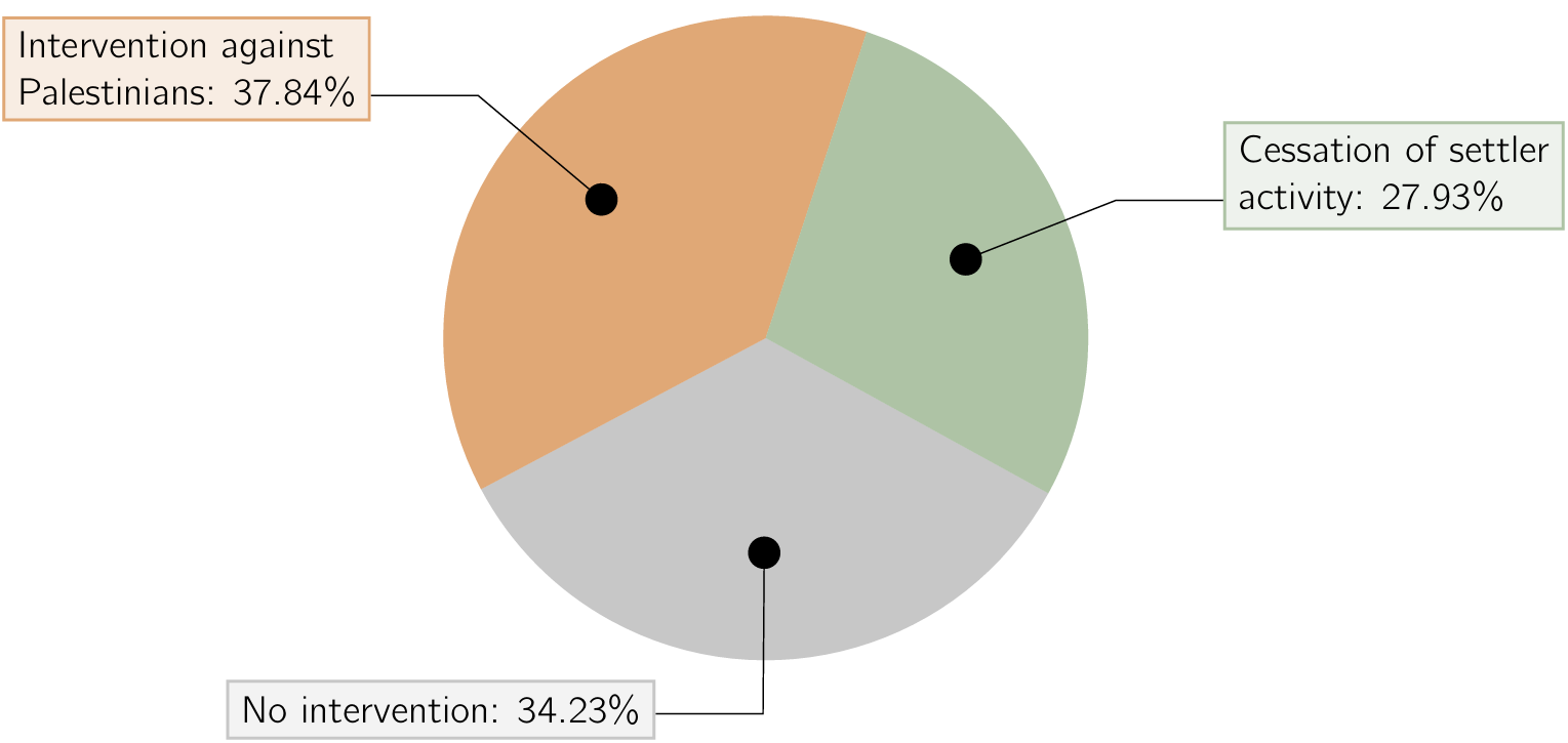 In 136 episodes of settler violence, the Israeli police were also present at the scene. As the occupying force, the police are required under international law to protect the rights of the occupied population. However, throughout the monitoring period, they never formally sanctioned the perpetrators. On the contrary, in most cases, the police – whose mere presence contributes to the ongoing oppression and denial of the Palestinian people’s right to self-determination – were themselves directly or indirectly responsible for further acts of violence against the Palestinian population (see Figure 3).