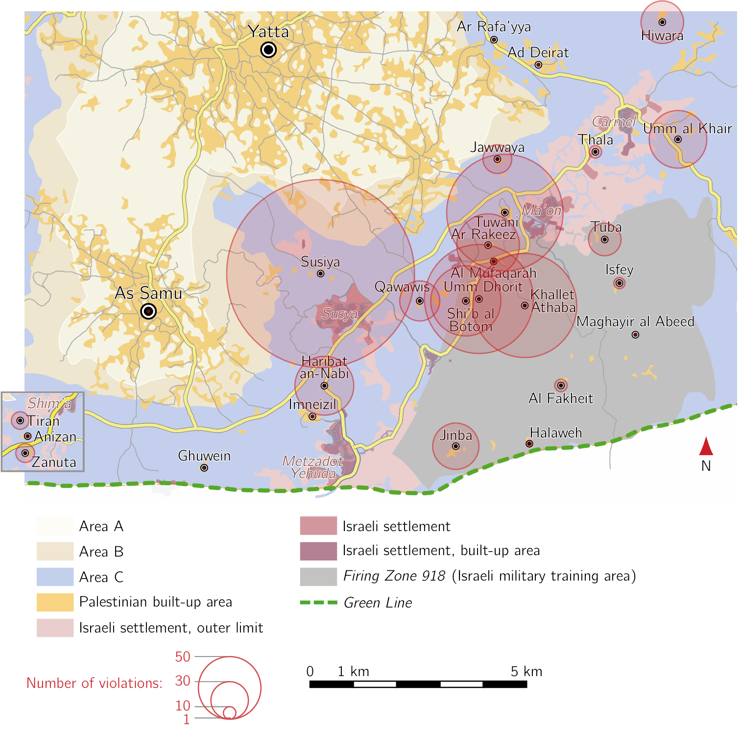 As regards the geographical distribution of the recorded violations (see Figure 1), the highest concentration of incidents occurred in the areas of Susiya (150), Tuwani (93), Umm Dhorit (87) and Khallet Athaba (83): these four villages alone account for 49% of all recorded incidents. These villages occupy strategic positions in the context of Israeli settlement expansion: they are either surrounded by or in close proximity to Israeli settlements, located on the edge of or within Firing Zone 918 (a military training area), or situated along key routes linking Palestinian population centres.
