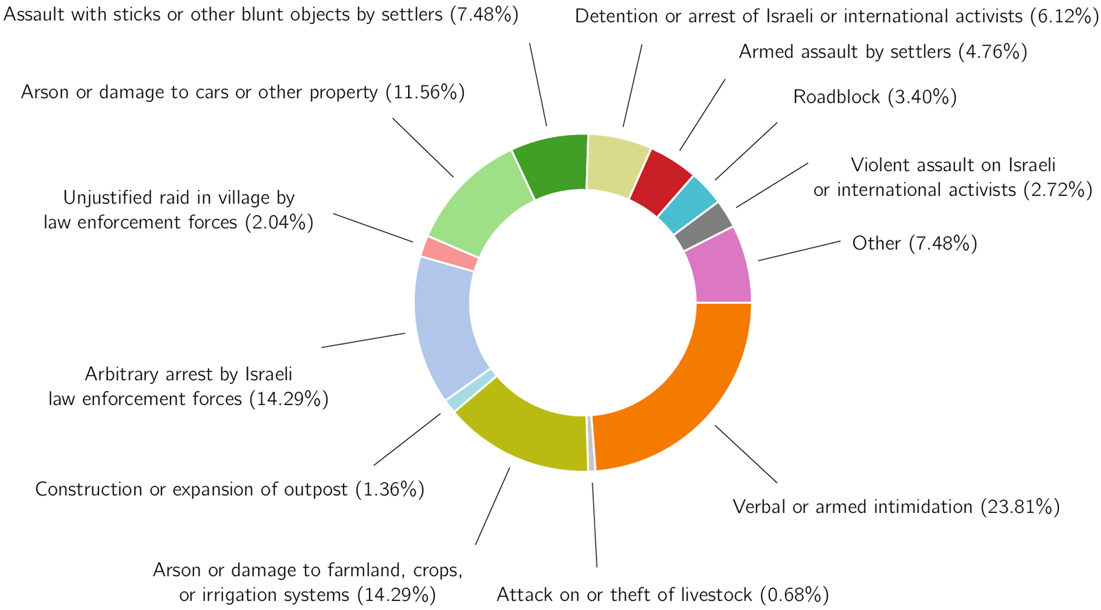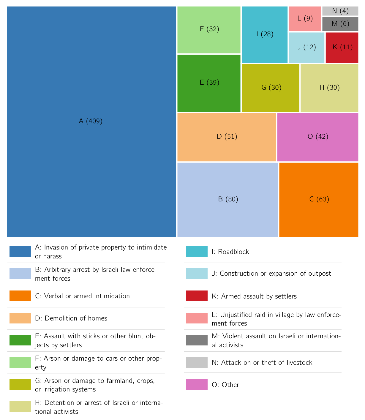 While the ethnic cleansing underway is driven by a colonial project of exclusive land appropriation, its first stage is the invasion of private Palestinian property. It is no coincidence, then, that the most frequently recorded violation was the invasion of Palestinian property for purposes of intimidation or harassment by settlers.
