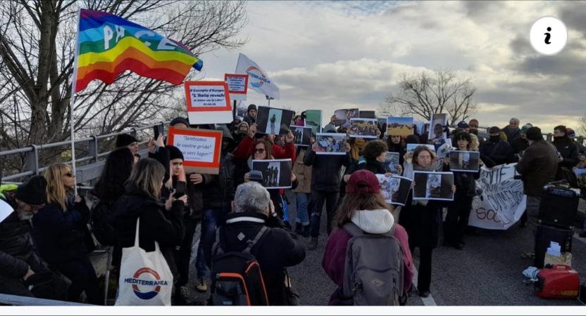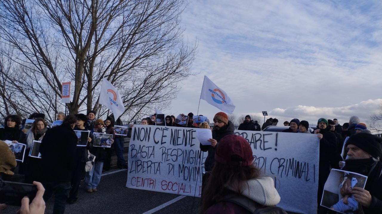 Fin dalle 15 del pomeriggio di lunedì 6 febbraio, un centinaio di attivistǝ hanno raggiunto il cantiere navale “Vittoria” di Adria (in provincia di Rovigo), che costruisce i nuovi mezzi per le deportazioni e, al tempo stesso, fornisce la manutenzione alle motovedette della Marina militare tunisina che agisce violentemente in mare contro le barche che cercano di raggiungere Lampedusa. La polizia presente in forze ha bloccato l’accesso al cantiere con transenne e blindati. Ad un certo punto, mentre stava arrivando il corteo delle “auto blu” delle Autorità, lǝ manifestanti hanno sfondato il blocco, giungendo ancora più vicino. Sono state lanciate uova con vernice rossa sulle strutture del cantiere, a simboleggiare il sangue versato dalle vittime innocenti delle politiche che causano la tragedia umanitaria del Mediterraneo centrale, e gridato l’indignazione verso queste politiche di morte e la loro vergognosa celebrazione. Lǝ attivistǝ innalzavano le fotografie provenienti dai lager libici (fornite da Refugees in Libya), in modo che lǝ tantǝ giornalistǝ convocatǝ dal Governo potessero riprenderle. In questo modo, nessuna notizia della “celebrazione” ha potuto essere separata da quella della contestazione.