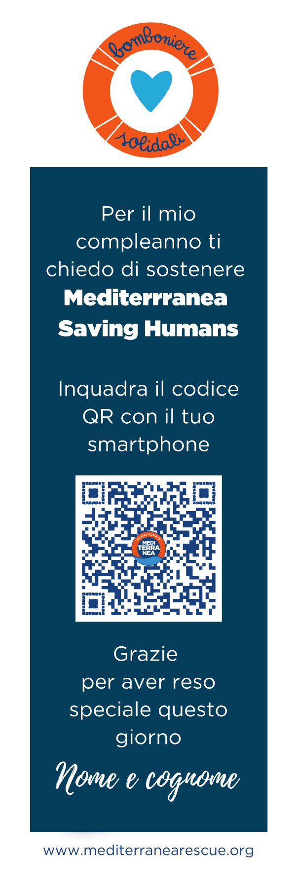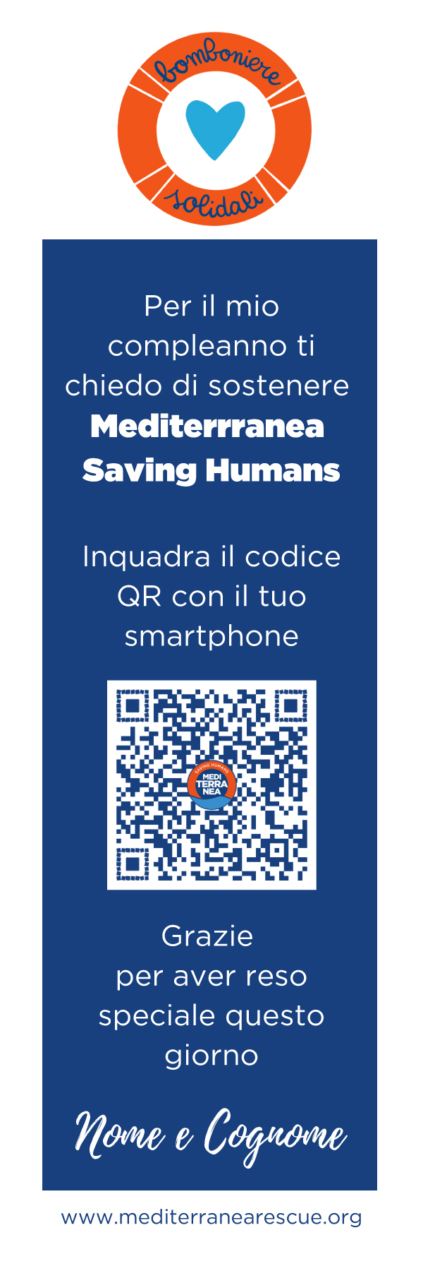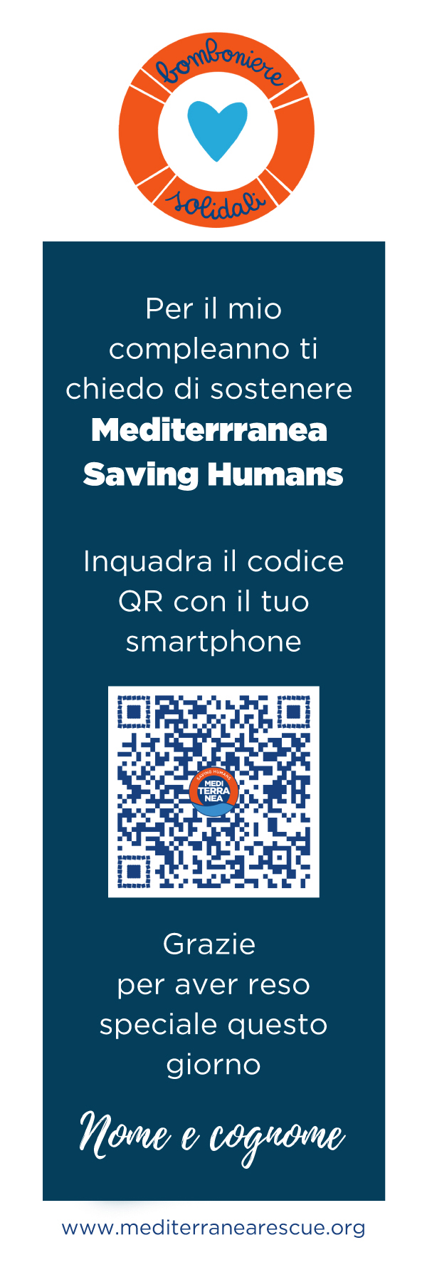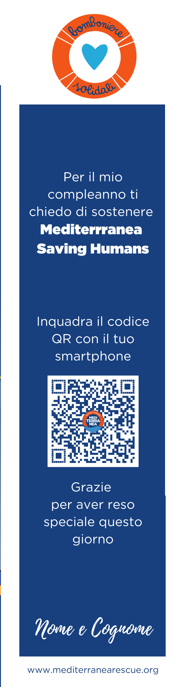 Il tuo contributo verrà usato per garantire miglia di navigazione alla nostra Mare Jonio e per fornire gli strumenti tecnici al nostro equipaggio di bordo, oltre ad assicurare la migliore assistenza medico-sanitaria e umanitaria alle persone che salviamo. Vuoi inserire una frase o una citazione? Puoi farlo: infatti le nostre Bomboniere sono prodotti grafici realizzati su misura e possono essere personalizzate a seconda delle tue esigenze! E ricorda: non esiste una cifra minima o giusta. Ogni bomboniera è un aiuto concreto per tutte le persone che salviamo in mare e qualsiasi contributo è utile a sostenere la nostra missione.