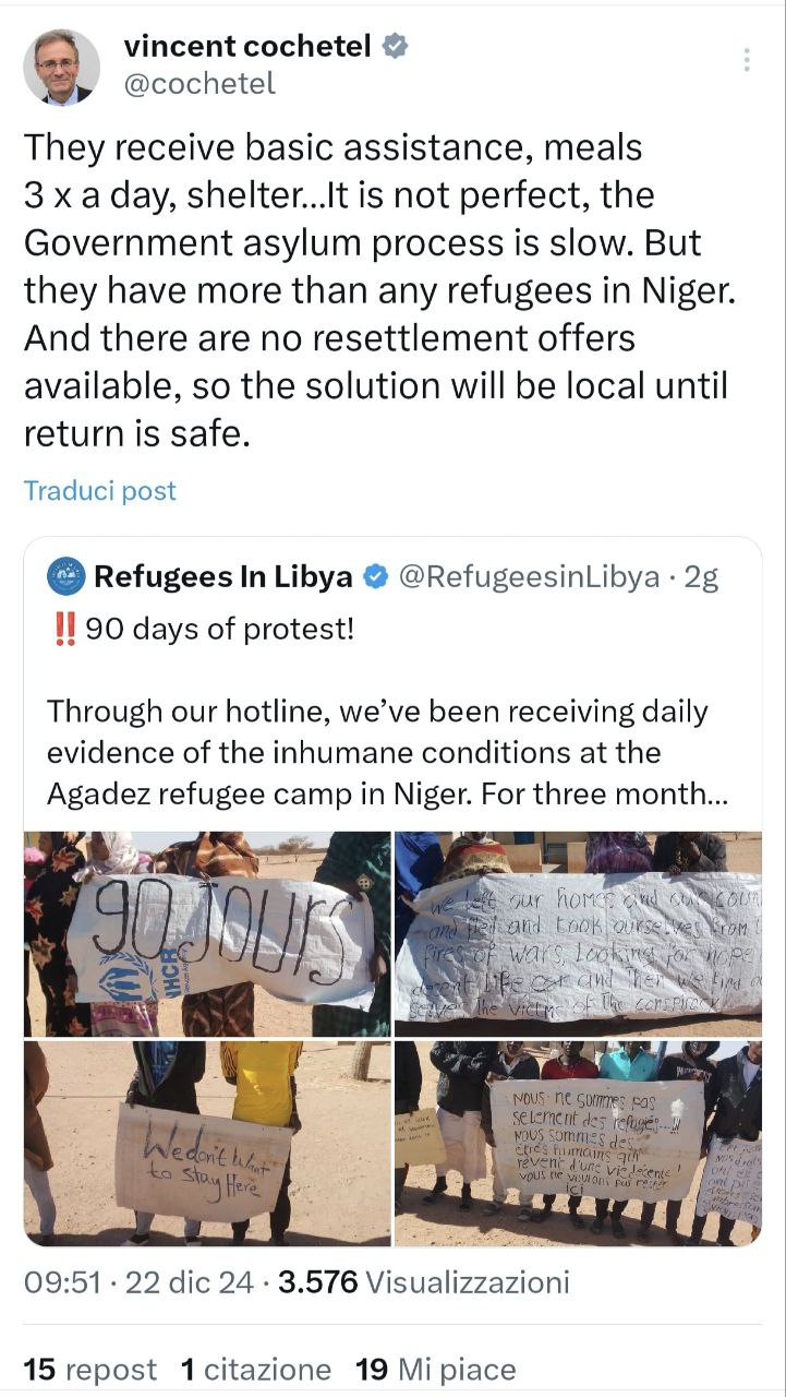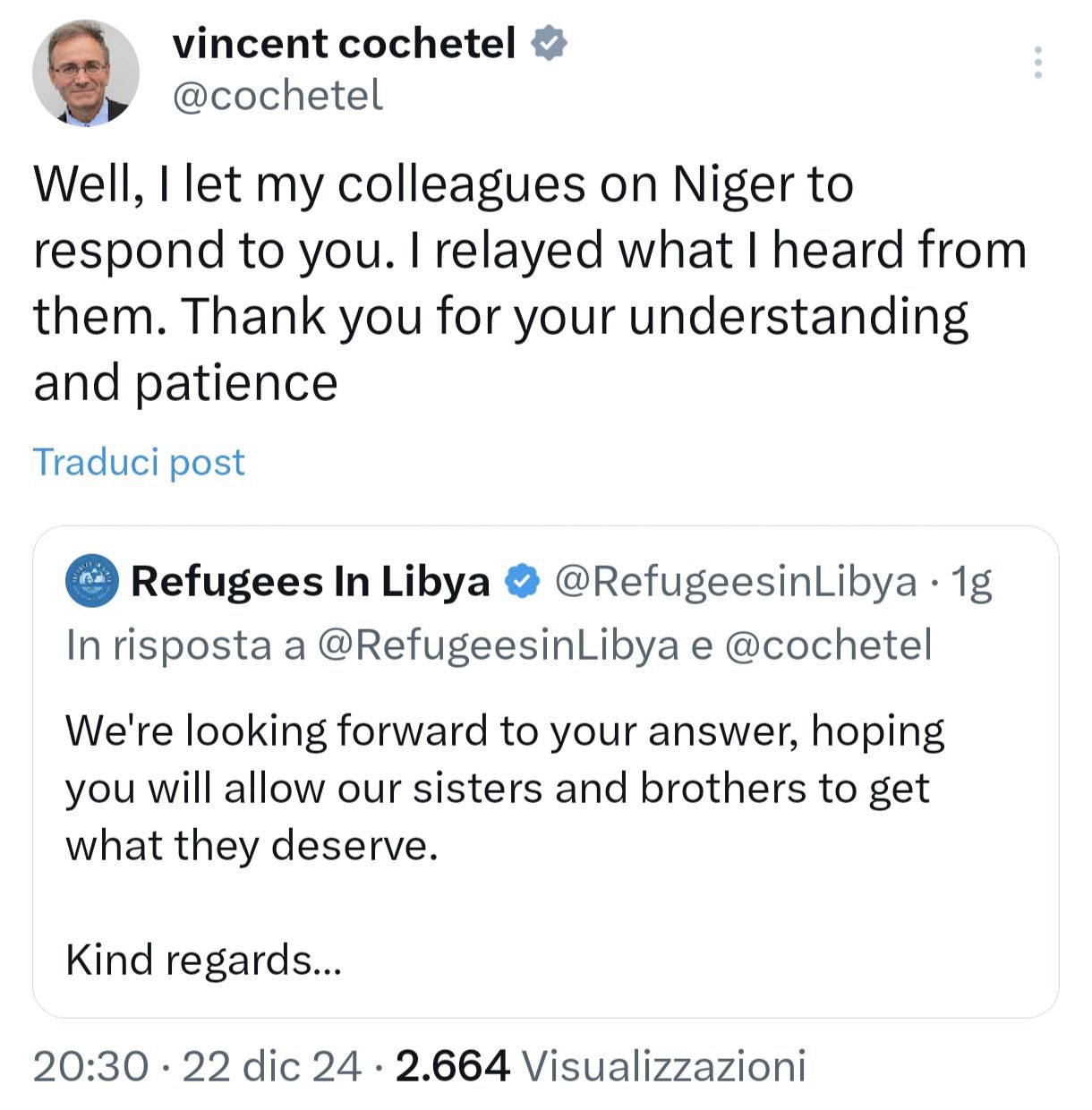 Dopo la denuncia pubblica di Refugees in Libya, l'inviato speciale per il Mediterraneo centro-occidentale di UNHCR Vincent Cochetel ha risposto pubbliamente su X alle rivendicazioni dellə rifugiatə prima affermando che essə erano statə sostenutə adeguatamente da UNHCR in attesa del rimpatrio, visto come unica possibile soluzione, e poi promettendo che si sarebbe messo in contatto con lə rappresentantə di UNHCR in Niger.