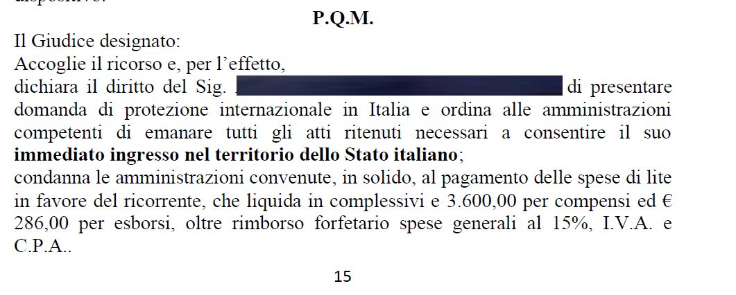 "Il giudice", dice la sentenza, "accoglie il ricorso e, per l'effetto, dichiara il diritto del sig. HARRY (nome di fantasia) di presentare domanda di protezione internazionale in Italia e ordina alle amministrazioni competenti di emanare tutti gli atti ritenuti necessari a consentire il suo immediato ingresso nel territorio dello Stato italiano".