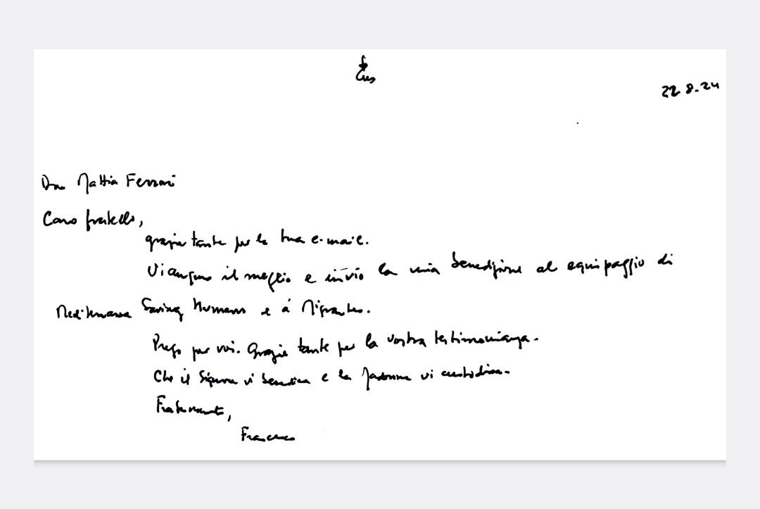 “Vi auguro il meglio e invio la mia benedizione all’equipaggio di Mediterranea Saving Humans e a Migrantes. Prego per voi. Grazie tante per la vostra testimonianza. Che il Signore vi benedica e la Madonna vi custodisca. Fraternamente, Francesco”