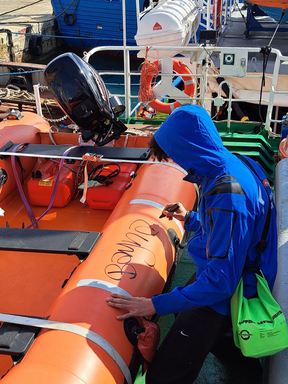 I volontari del gommone di Ghali, che si sono esercitati per tutto il fine settimana, hanno individuato il gommone di soccorso in avvicinamento. Al segnale, si sono agitati, gridando in inglese: “Hello! Hello! We are here!”. Un amichevole "Hello!" è stato lanciato in risposta dall’imbarcazione di soccorso. “Siamo una nave italiana, siamo qui per aiutare tutti voi”, spiega un volontario di nome Gabriele Mantici, skipper professionista e apneista. “Ma dovete stare calmi.”