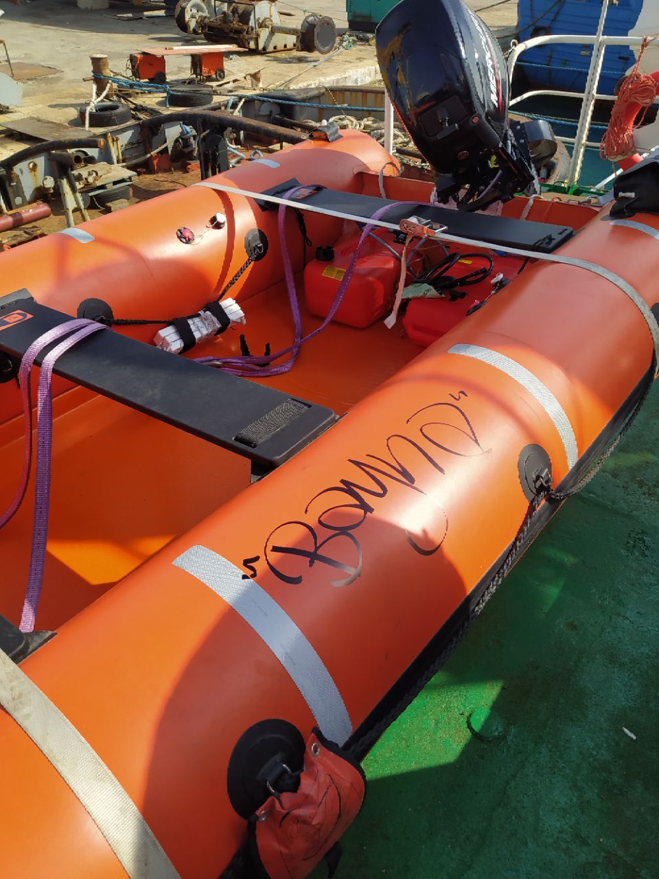 Il gommone Ghali si tranquillizza e il RHIB si avvicina abbastanza per poter distribuire i giubbotti di salvataggio. Una volta che tutti si sono allacciati la cintura, inizia il trasbordo.