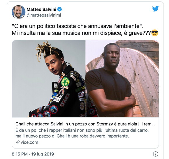 Salvini, forse l'uomo più potente in Italia all'epoca, litiga su Twitter con il rapper. Linkando un articolo di VICE Italia con il titolo "Ghali che attacca Salvini in un pezzo con Stormzy è pura gioia", cita il testo di Ghali prima di aggiungere: "Mi insulta ma la sua musica non mi dispiace, è grave???" con l’emoji degli occhiali da sole.